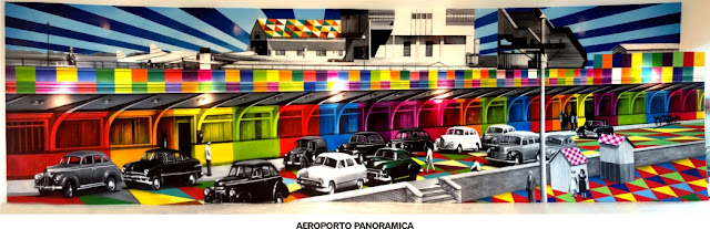 Como surgiu isso de pintar grandes espaços? Você pinta antes em escala menor como teste ou vai direto no local? Dificilmente faço grandes mudanças quando já estou no local, pintando, todas as alterações, e criações são feitas anteriormente, no meu bloco de anotações, depois no meu caderno de desenho, na sequência em uma tela, que inclusive para todos os murais sempre tenho uma tela original. E é justamente sobre este suporte que faço todos os testes necessários, resolvo todas as questões, só depois de tudo resolvido e preparado, passo isso para os murais, independentemente da escala.