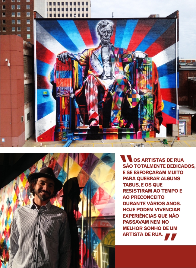 Os espaços urbanos estão sendo cada vez mais tomados pela street art, isso ajuda contra o preconceito? Grande parte dos preconceitos acontecem por falta de conhecimento, eu acompanhei todo este processo nas ruas, é logico que a mudança é visível, da fase em que tanto a polícia, quanto transeuntes comuns, nos rotulavam como vagabundos, maloqueiros, até o momento atual, em que a street art ocupa desde comunidades carentes até avenidas e galerias de arte nos bairros mais nobres de cidades no mundo todo. Percebendo isso por um ângulo mais geral, os artistas de rua são totalmente dedicados, e se esforçaram muito para quebrar alguns tabus, e os que resistiram ao tempo e ao preconceito durante vários anos. Hoje podem vivenciar experiências que não passavam nem no melhor sonho de um artista de rua.