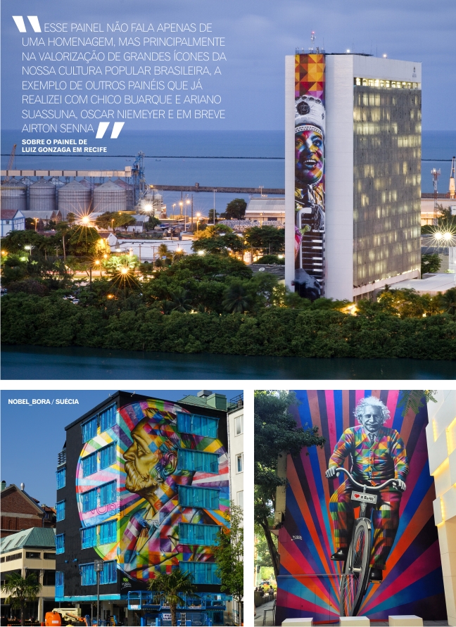 Você causou sensação em Recife ao pintar o “rei do baião”. Conta pra gente um pouco desse trabalho. Vale comentar que com 90 metros de altura, este é o segundo maior mural do mundo, em altura, ficando atrás apenas de um trabalho feito na Europa, com 108 metros de altura. Esse painel não fala apenas de uma homenagem, mas principalmente na valorização de grandes ícones da nossa cultura popular brasileira, a exemplo de outros painéis que já realizei com Chico Buarque e Ariano Suassuna, Oscar Niemeyer e em breve Airton Senna. Espero ter a oportunidade de retornar a Recife, pois o que mais gostei na cidade foi a simpatia das pessoas, isso ficou gravado na minha memória, e sempre vou falar bem das pessoas de Recife.