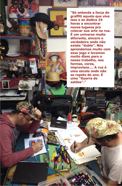 Nascidos e criados em São Paulo, no Cambuci, um bairro tradicional na região central da Cidade, estes gêmeos univitelinos me impressionaram. Nunca havia visto tanta conexão no olhar e tanta cumplicidade no traço – quando um traça um rosto ou uma vestimenta, o outro vem e preenche com cores e patterns, eles nem se olham, e tudo sai perfeito, como se fossem um mesmo cérebro, como se pensassem juntos.