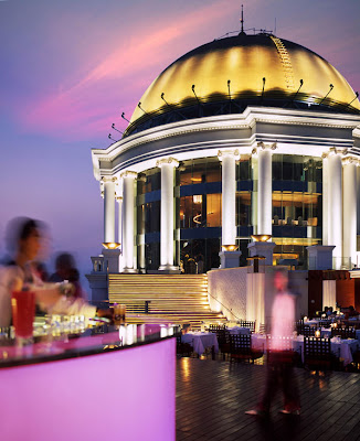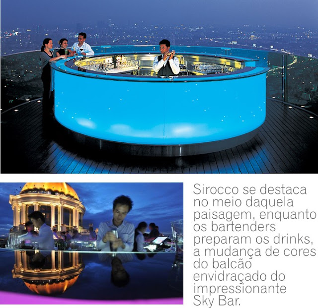 Com um serviço impecável que começa já no térreo do State Tower, edifício onde fica o hotel, recepcionistas indicam o caminho até o terraço do edifício, no 63° andar. Onde a cúpula dourada do restaurante Sirocco se destaca no meio daquela paisagem, enquanto os bartenders preparam os drinks, a mudança de cores do balcão envidraçado do impressionante Sky Bar. Os guarda-corpos em vidro que resguardam o espaço criam uma atmosfera lúdica e vertiginosa. Inaugurados em 2003, pelo escritório de arquitetura DWP, Design Partnership Worldwide, se tornaram logo uma atração turística. Com capacidade para 150 pessoas, o restaurante oferece cozinha mediterrânea e apresenta uma vista magnífica, enaltecendo o cenário de Bangkok. www.lebua.com/sirocco