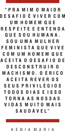 Qual o maior desafio da vida à dois? Somos um casal heterossexual. Pra mim o maior desafio é viver com um homem que respeite e entenda que sou humana. Sou uma mulher feminista que vive com um homem que aceita o desafio de desconstruir o machismo. O Érico aceita rever os seus privilégios todos dias e isso torna as nossas vidas muito mais saudável.