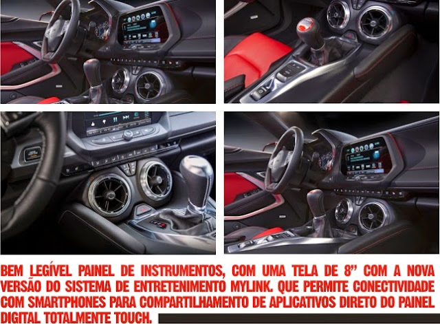 Outros destaques ficam por conta dos detalhes internos, com iluminação em 24 tonalidades, à escolha do cliente, e um novo e bem legível painel de instrumentos, com uma tela de 8″ com a nova versão do sistema de entretenimento MyLink. Que permite conectividade com smartphones para compartilhamento de aplicativos direto do painel digital totalmente touch. Também não podemos deixar de citar as funcionais saídas de ar, com anéis exclusivos para controlar a temperatura. Por enquanto, o Chevrolet Camaro não tem data e preço para chegar no Brasil.