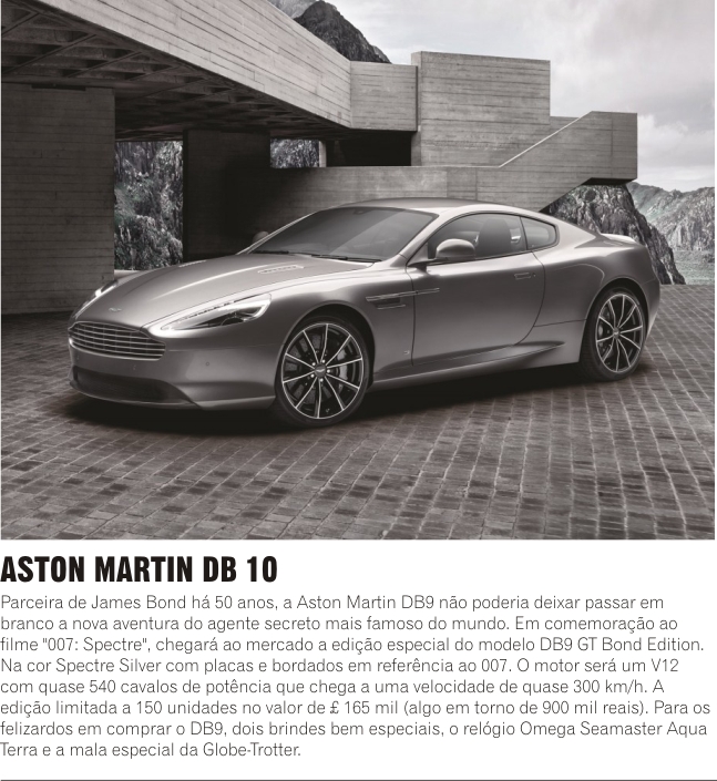 Outra marca registrada do famoso agente são os incríveis carros dirigidos, e destruídos” nos filmes. Para o novo filme irão desfilar outras máquinas tão imponentes quanto o tradicional Aston Martin. A Jaguar Land Rover também preparou outras três máquinas exclusivamente para os outros personagens importantes da trama. Confira aqui os destaques da vez.