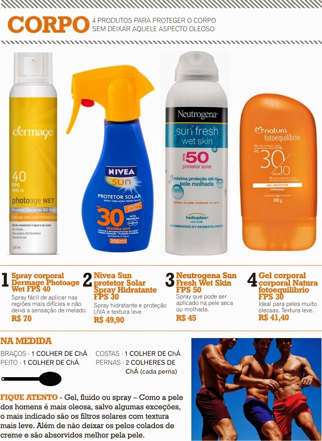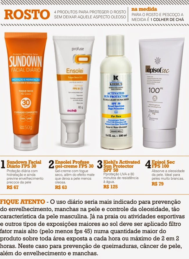 O índice certo pra você – É importante observar o fator de proteção (FPS) específico para seu tipo de pele. Por exemplo, os do tipo 15 são indicados para peles morenas e negras; os de 30 e 40 são indicados para quem se avermelha facilmente; e os do tipo 50 ou mais, são indicados para peles muito brancas e sensíveis. Lembre-se que, nas áreas mais sensíveis necessitam de um FPS mais elevado, como o rosto, os lábios, as orelhas e o couro cabeludo (atenção especial para os carecas).