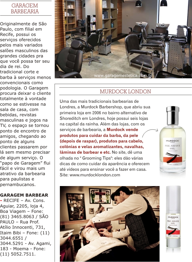 Nestes centros de beleza, os serviços vão muito além das antigas e tradicionais barbearias que só cortavam cabelo e faziam a barba. Há coloração, limpeza de pele, massagens, depilação, manicure e pedicure e outros serviços para renovar os moçoilos. E enquanto são atendidos nada de revistas de fofocas e novelas, mas Playboys, Vips, Men´s Health e claro, essa revista que estão a ler. A proposta dos salões de beleza masculinos é deixar o cliente à vontade e bem servido, muitos oferecem cerveja gelada, dose de whisky, jogos de futebol na TV, games eletrônicos e tudo mais que for interesse do cliente.