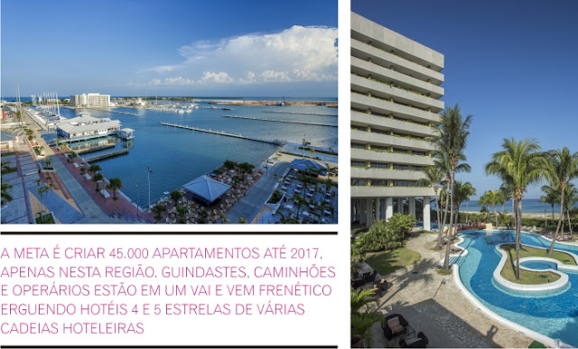 Atravessamos os municípios de Villa Clara, Remédios e Caibarién até a incrível Pedraplén, uma estrada de 48 quilômetros construída sobre o mar protegido pelos Cayos (sequência de ilhas) que leva ao Cayo Santa Maria passando pelo Cayo Ensenachos e Cayo Las Brujas. Nessas ilhas em obras, está sendo construindo um novo perfil turístico para Cuba. A meta foi criar 45.000 apartamentos até 2017, apenas nessa região. Guindastes, caminhões e operários estão em um vai e vem frenético, erguendo hotéis 4 e 5 estrelas de várias cadeias hoteleiras como os da rede Iberostar, Accor, Pullman, Mercure, Ibis, Sofitel e também Meliá, que nos recebeu para dois dias em seu Hotel Meliá Las Dunas.