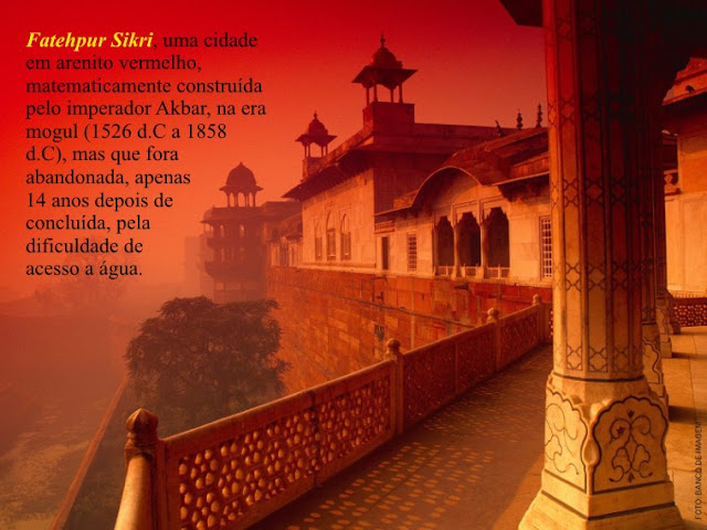 Saindo de Agra para Jaipur, o encantamento com o passado da realeza, sua riqueza, luxo e caprichos, só aumenta. Paramos em Fatehpur Sikri, uma cidade em arenito vermelho, matematicamente construída pelo imperador Akbar, na era mogul (1526 d.C a 1858 d.C), mas que fora abandonada, apenas 14 anos depois de concluída, pela dificuldade de acesso a água. Akbar teve três esposas: uma hindu, uma crista e outra muçulmana. Fez um palácio pra cada uma delas, com arquitetura e obras de arte referentes a religião a que pertenciam. Sempre as tratou com igualdade, mas no fim acabou por construir um palácio maior para a esposa hindu, que o presenteou com seu primeiro filho homem. Os indianos até hoje o consideram um dos soberanos mais admirados, pois Akbar uniu o país ao colocar as três religiões no mesmo patamar.