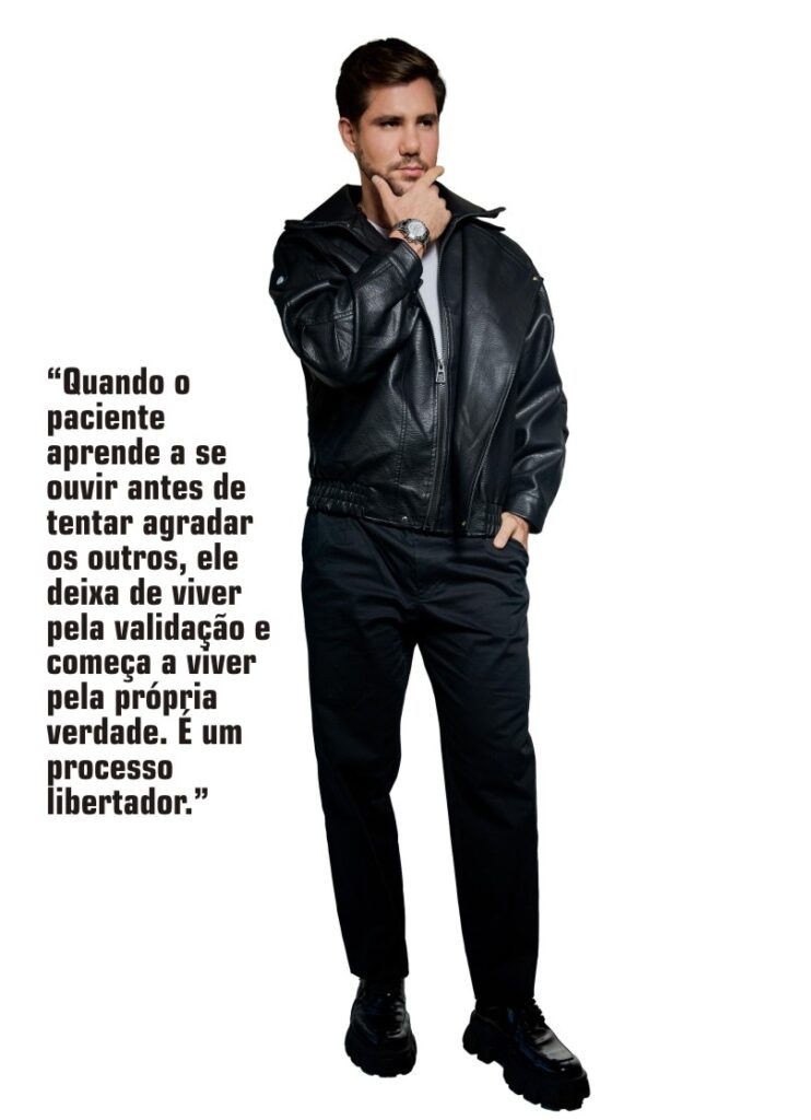 Em um mundo cada vez mais orientado por validação externa, como você ajuda seus pacientes a desenvolverem uma relação mais autêntica consigo mesmos? Eu trabalho muito com dois pilares: consciência e responsabilidade emocional. Primeiro, ajudo o paciente a entender de onde vem à necessidade de aprovação: família, história de vida, rejeições, medos. Depois, a gente constrói uma relação mais estável com ele mesmo. Isso passa por limites, autoestima e pela capacidade de tolerar frustração — algo que poucos conseguem hoje. Quando o paciente aprende a se ouvir antes de tentar agradar os outros, ele deixa de viver pela validação e começa a viver pela própria verdade. É um processo libertador.