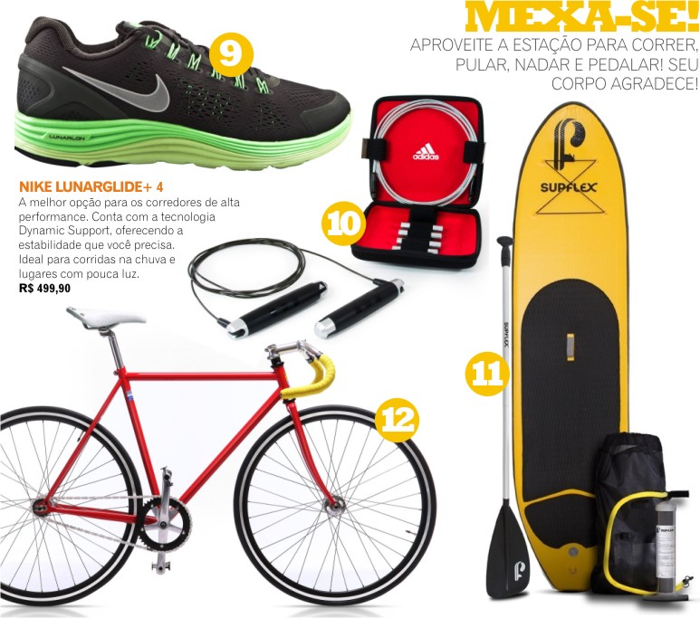 (11) PRANCHA STAND UP PADDLE SUPFLEX – Geralmente as pranchas de stand up possuem mais de 2,5 metros, dificultando seu transporte e armazenamento. Para solucionar esses problemas, a marca Supflex acaba de lançar a prancha inflável. Fabricada em PVC flexível com interior reforçado com milhares de fibras de nylon de alta resistência, devido a sua tecnologia de construção, pode aguentar 15 libras de pressão de ar. Depois de desinflada, a prancha pode ser dobrada e guardada na bolsa. Assim como seu remo desmontável. R$ 2.980 – www.supflex.com.br
