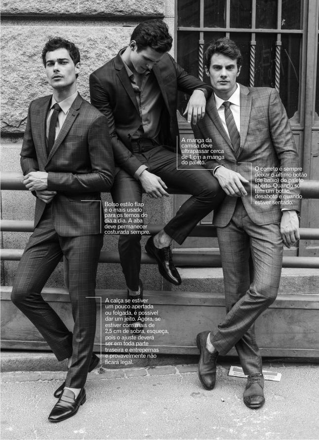 Começando pelos erros… O maior e mais notável erro é no tecido ou no tamanho. A dica – para o tecido – é a lã, desde que a trama do frio seja adequada ao clima do lugar. Quanto às medidas, o caimento tem de ser perfeito, por isso tem que estar atento na altura do punho, bainha, encaixe de colarinho e de ombros. A meia é outro item que não deve ser esquecido. É preciso lembrar que ela deve ser uma extensão da calça ou da camisa e não deve contrastar com a cor da calça. Seguindo estas regras você estará sempre bem vestido, independente da label que está usando.