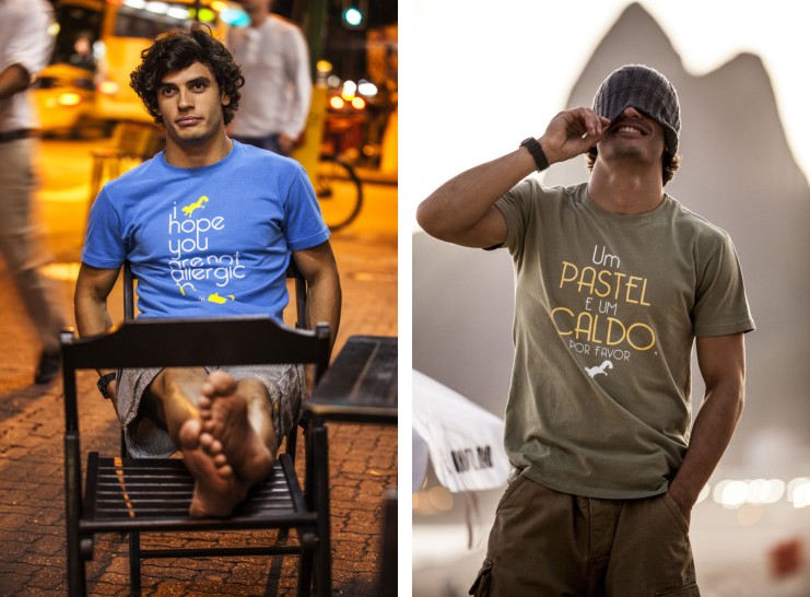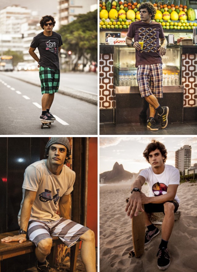 As estampas das camisetas trazem o famoso esquilo, símbolo da grife, que divide a cena com diferentes ilustrações que estão mais do que na moda: bigodes, esqueletos estilizados e óculos, além de frases como “Um pastel e um caldo, por favor” e “I hope you are not allergic to nuts” (“eu espero que você não seja alérgico a nozes”, em inglês), que demonstram o bom humor da marca. Já as bermudas ganham um destaque especial em xadrez e listras, combinadas com cores, que fazem menção ao estilo praiano e “modernoso” do carioca.