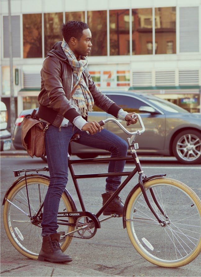 Calça jeans, jaqueta de couro, bota e uma “Bike Brooklyn Cruiser”. Estilo traduz esse look! Podemos ver que os acessórios são essenciais na produção de um look cheio de estilo e personalidade e nesse podemos ver claramente a ousadia do cachecol colorido inserido nas peças de cores neutras.