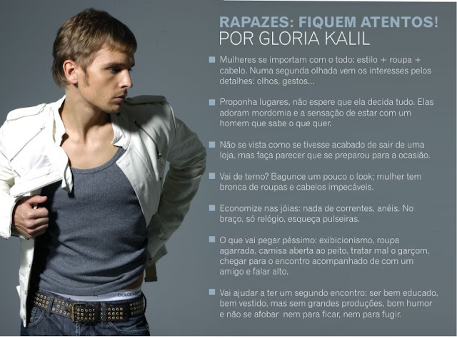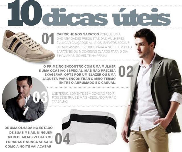 Que as mulheres apreciam um homem bem vestido, isso não é novidade. Mas quais peças elas não admitem serem usadas no primeiro encontro? Fiz uma pequena lista dos itens que podem detonar o seu dia de conquista: pochete, por exemplo, é uma peça que não deve estar no guarda-roupa de nenhum homem, nem para usar em um único encontro. Sapato social com meia branca, se você não for cover do Michael Jackson é melhor esquecer! Bermuda e chinelo também não são adequados (a não ser que o encontro seja na praia). As mulheres também não apreciam excesso de perfume, camisa aberta, modelito rapper (correntes, pulseiras ou muitos anéis ), roupas muito justas, coloridas demais ou velhas.