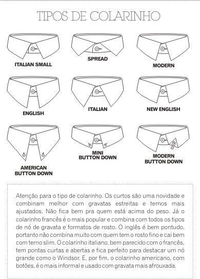 Atenção para o tipo de colarinho. Os curtos são uma novidade e combinam melhor com gravatas estreitas e ternos mais ajustados. Não fica bem pra quem está acima do peso. O colarinho francês é o mais popular e combina com todos os tipos de nó de gravata e formatos de rosto. O inglês é bem pontudo, portanto não combina muito com quem tem o rosto fino e cai bem com terno slim. O colarinho italiano, bem parecido com o francês, tem pontas curtas e abertas e fica perfeito para destacar um nó grande como o Windsor. E, por fim, o colarinho americano, com botões, é o mais informal e usado com gravata mais afrouxada.