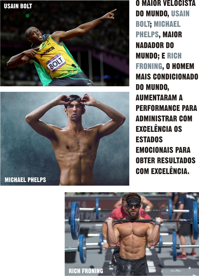 Eu descobri que os maiores atletas da história, como Bannister, Bradley e tantos outros, inclusive os que eu mais admiro na atualidade: o maior velocista do mundo, Usain Bolt; Michael Phelps, maior nadador do mundo; e Rich Froning, o homem mais condicionado do mundo, aumentaram a performance para administrar com excelência os estados emocionais para obter resultados com excelência. Além de praticar de forma incansável e seguir um planejamento com definição de metas inteligentes, eles focam na solução e nunca no problema / obstáculo.