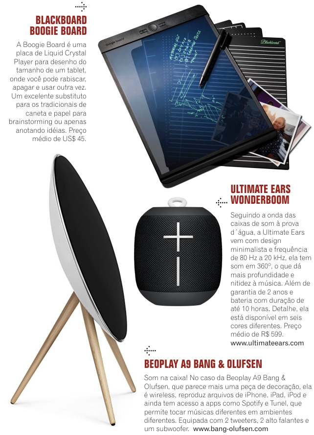 Muito além de ser apenas um equipamento tecnológico esses gadgets são objetos de design de última geração. A cada avanço da tecnologia novas possibilidades para velhos costumes. Fizemos uma seleção de 10 novos equipamentos que são uma bela prova disso e vão deixar o Natal de qualquer um mais tech de todos os Natais. Vai ter muito marmanjo escrevendo cartinha para Papai Noel ficar de olho nesses gadgets.
