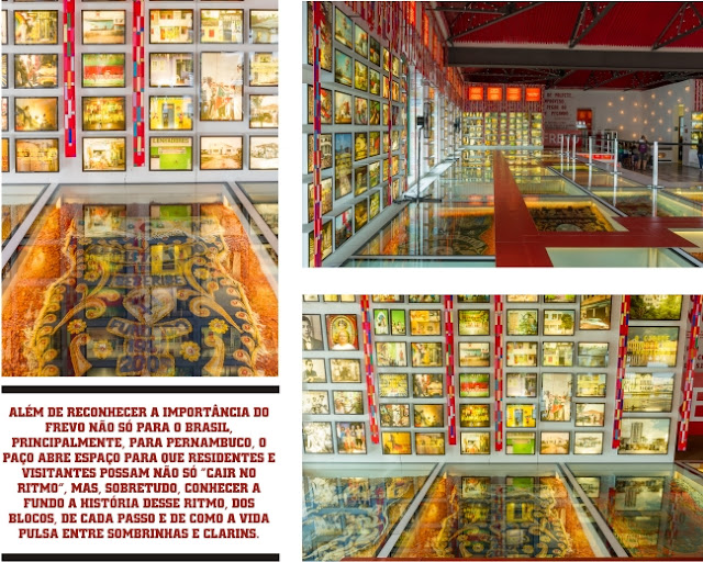 Quem vai ao Paço tem a oportunidade de conhecer desde os principais acontecimentos da história do frevo na linha do tempo, no térreo do prédio, até os estandartes e flabelos de importantes blocos e agremiações pernambucanos na estonteante Praça do Frevo, no 3º andar do imóvel restaurado.