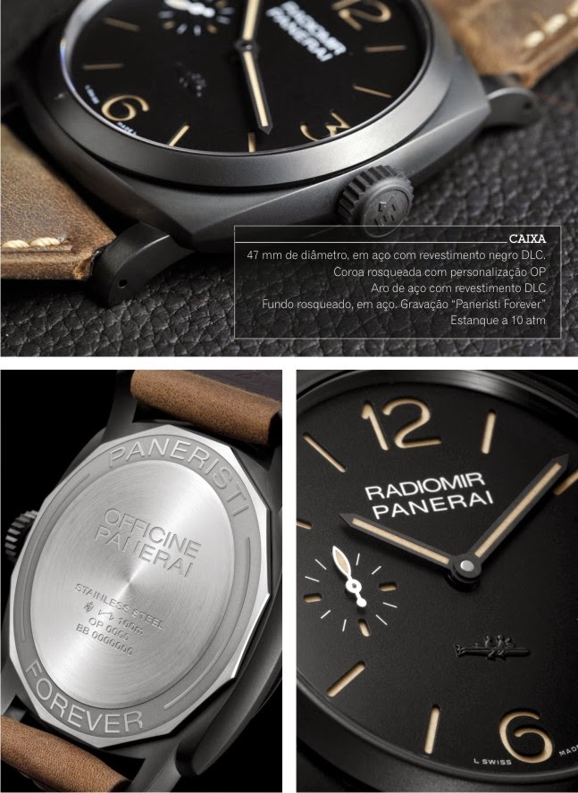 47 mm de diâmetro, em aço com revestimento negro DLC. Coroa rosqueada com personalização OP. Aro de aço com revestimento DLC. Fundo rosqueado, em aço. Gravação “Paneristi Forever”. Estanque a 10 atm.