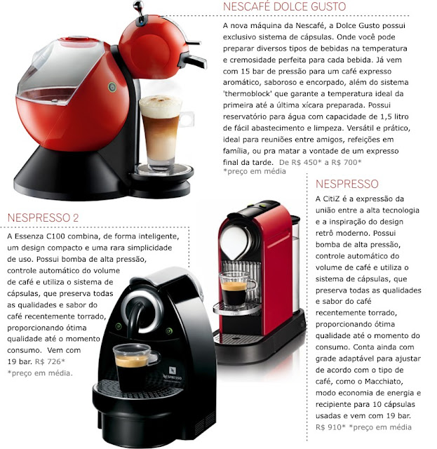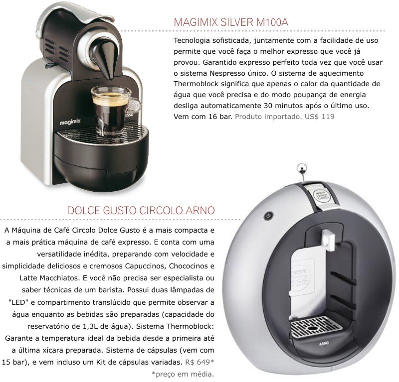 Com a popularização do café expresso, as máquinas de café ganharam outros ares e modelos. Algumas chegam a receber prêmio de design e a cada lançamento mais variedades de bebidas são oferecidas e procuram ganhar o cliente pelas suas formas diferenciadas. O sistema de cápsulas de variados aromas, conhecidas como “bar”, virou um produto à parte. Selecionamos algumas das máquinas mais legais do mercado e suas devidas características. Escolha a que melhor se adeque ao seu desejo e bom café!