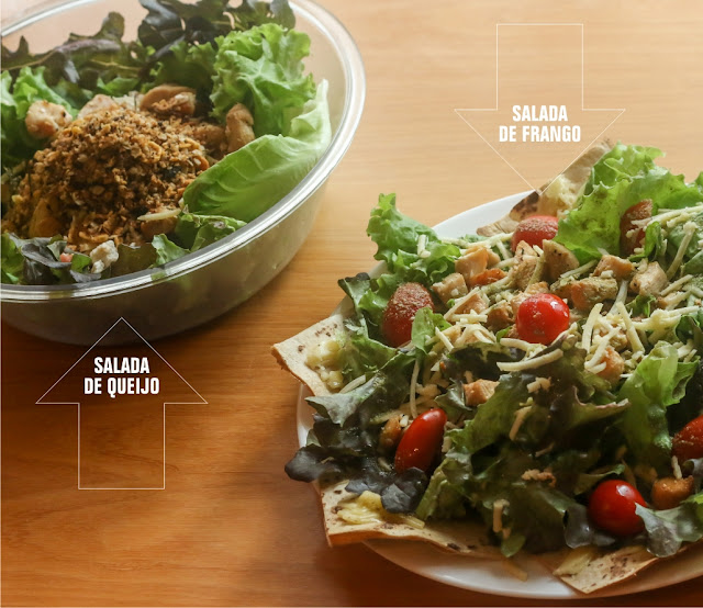 Mix de folhas, cubos de frango grelhado, tomate cereja, queijo parmesão, molho pesto com limão siciliano e massinha de pizza integral maçaricado com muçarela.