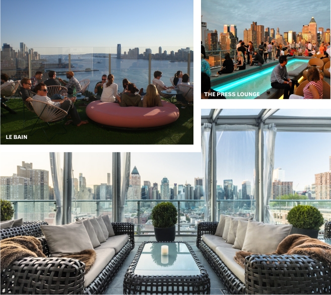 O The Press Lounge tem uma vista incrível para o sunset no Rio Hudson e do highline de Manhattan. Gente bonita, ótimos drinks, ao som de jazz, bossa nova e lounge music. Vale a visita apenas para drinks, e claro, chegue antes do pôr do sol. Site: thepresslounge.com