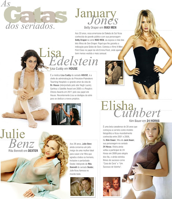 Por outro lado, um dos grandes atrativos das séries de TV são as belas mulheres que surgem para provocar os heróis da trama e seus espectadores. Em elgumas séries, como Dexter, elas até aparecem nuazinhas em cenas pra lá de provocantes. Selecionamos quatro dessas belas mulheres dessas quatro séries de sucesso. Conheça um pouco mais sobre cada uma delas.